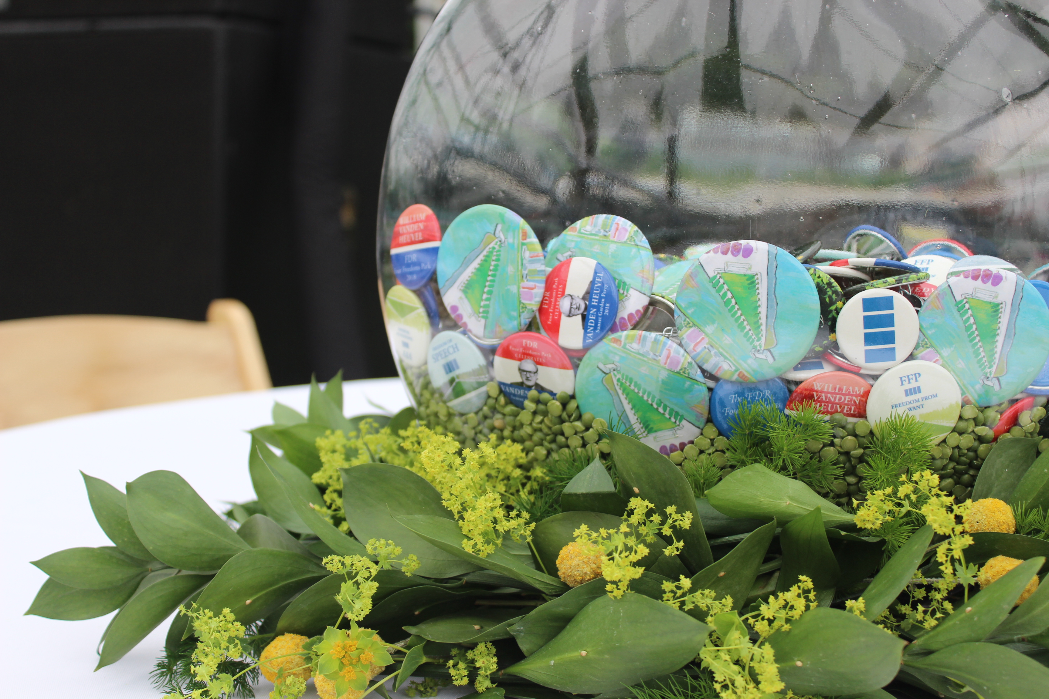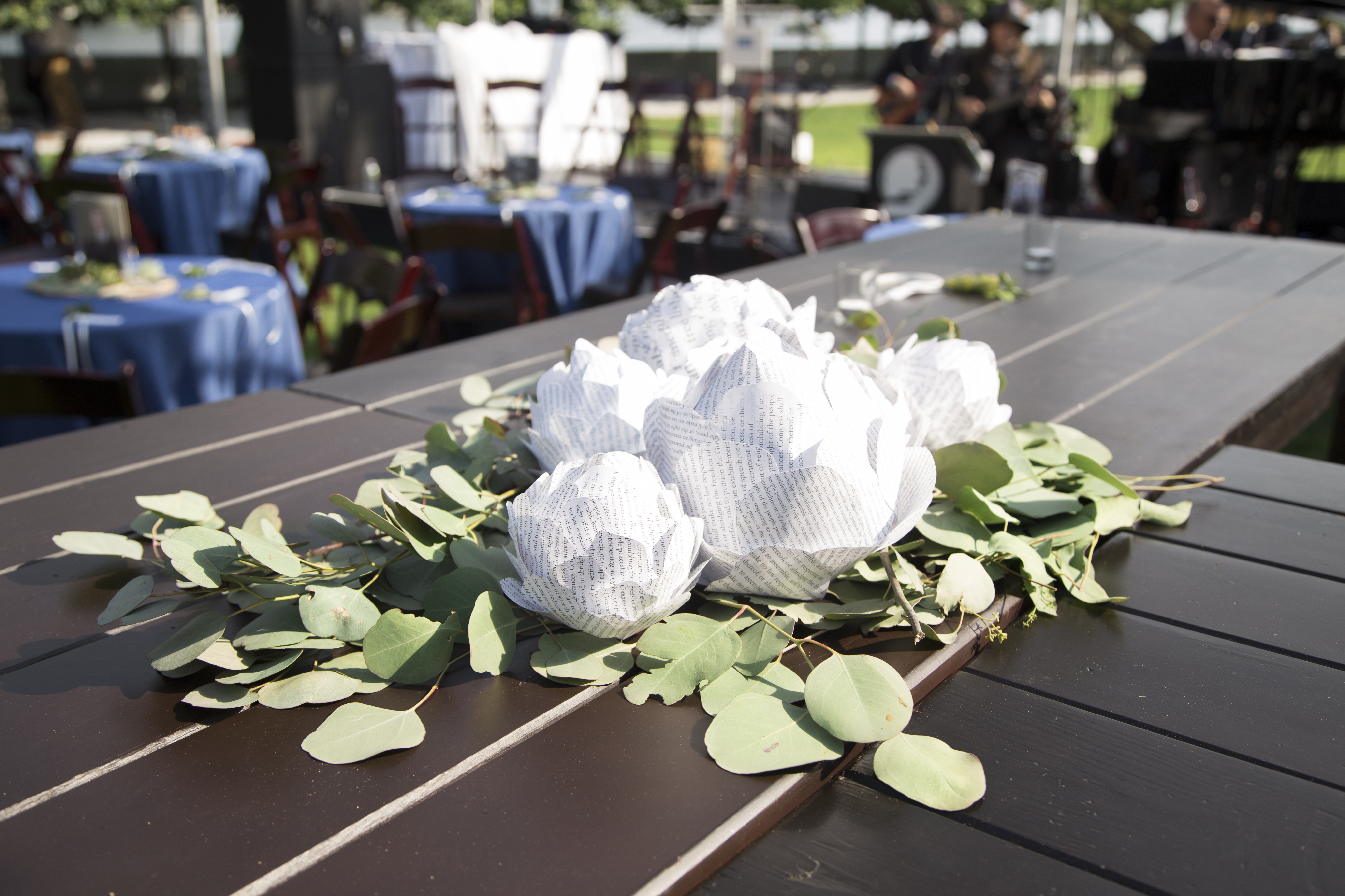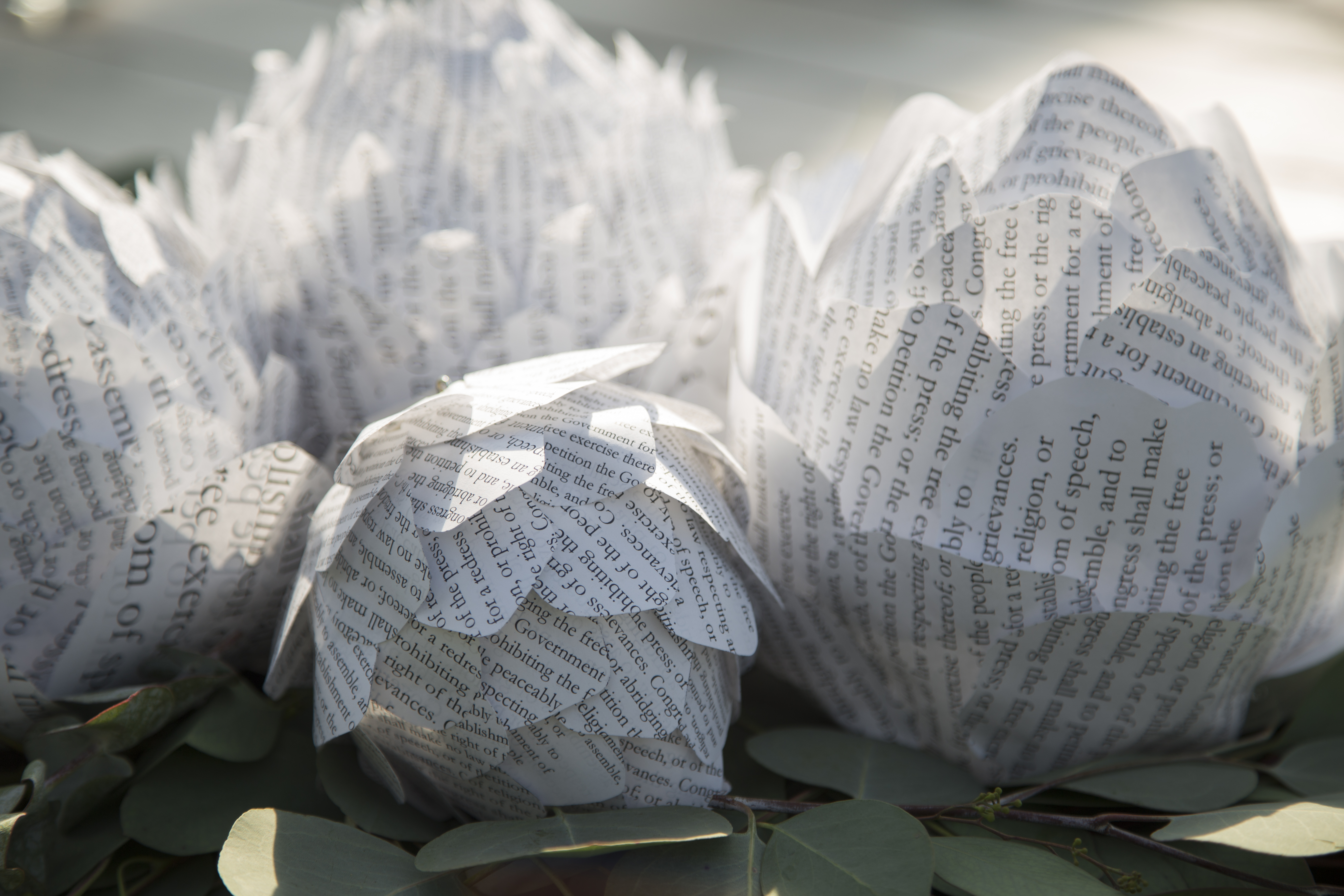 The FDR Four Freedoms Park : Custom centerpieces, paper flowers with first amendment text in varying font sizes